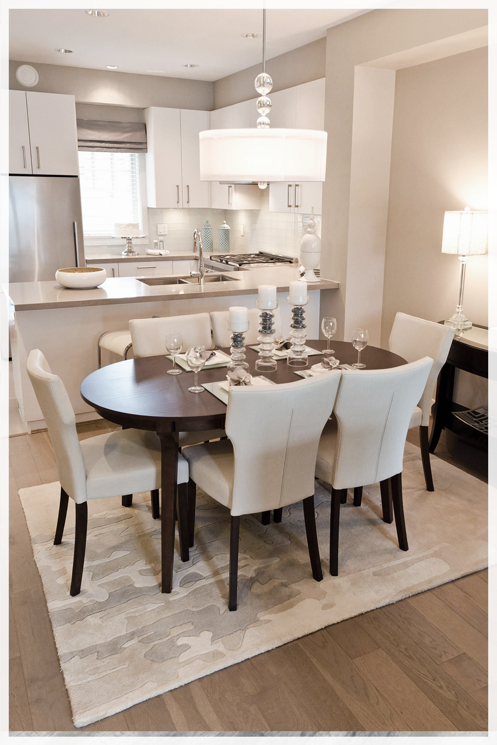 For a transitional dining room, this style is an elegant and classic style you want to adopt. Look how its comfy dining sofa wrapped in soft colors define its flair. The all-white scheme makes this small kitchen and dining room combo look more spacious.