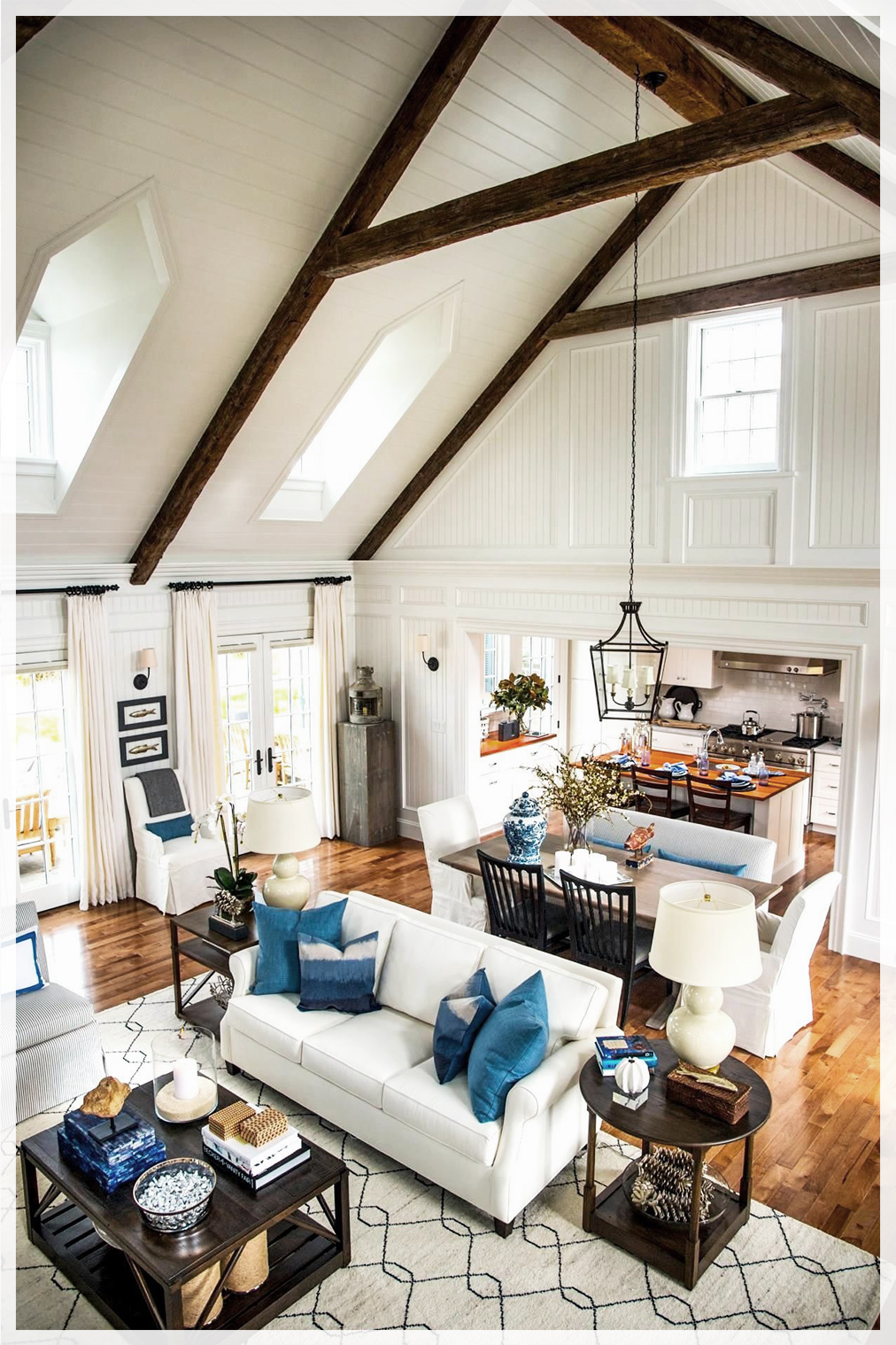 This beach style kitchen dining room combo looks spacious. The high ceiling is accented with the wooden beam where you can hang some antique lanterns. Its white walls and grey floor give the airy look to the whole design.
