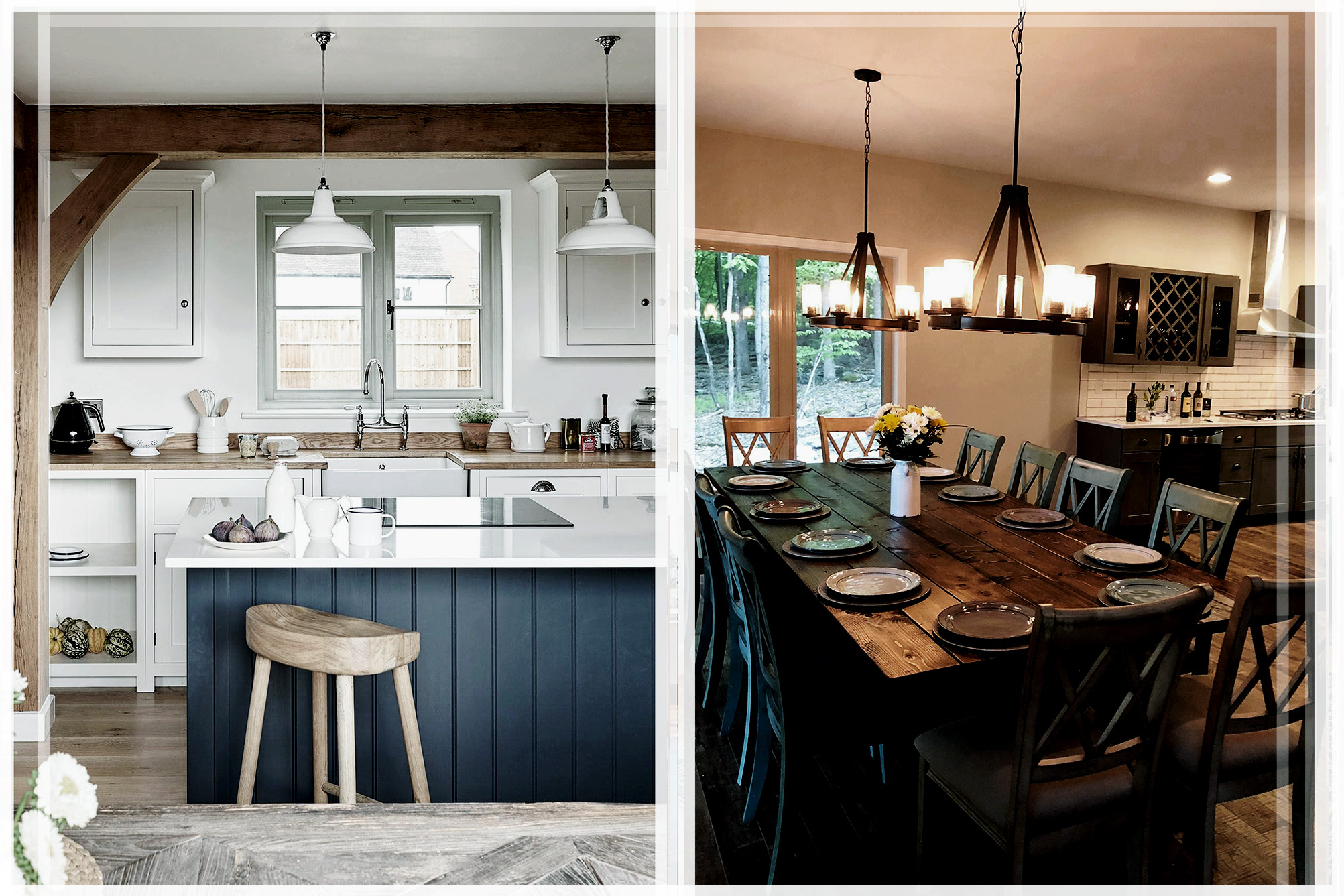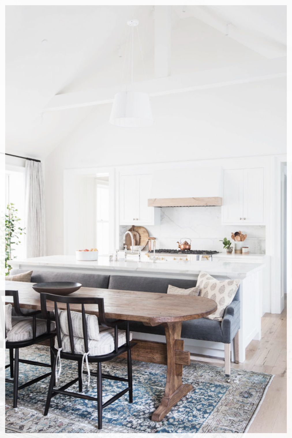 A farmhouse style kitchen and dining room combo that will definitely inspire the way you decorate your very own space. Be bold with the different types of chairs, colors and accessories. It creates just a perfect chic combination for a dining set accompanying the all-white kitchen.